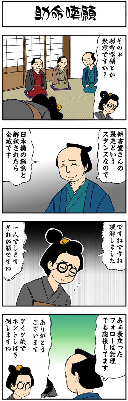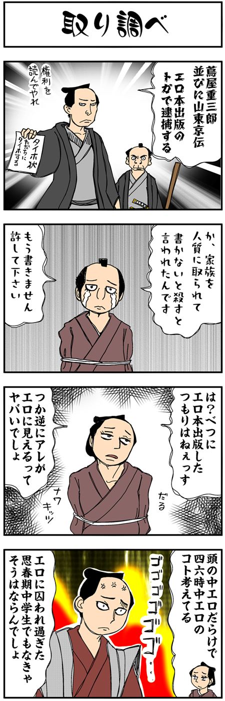 洒落本を「教訓読本」に偽装して販売したのですから、そりゃあ、町奉行所もアホじゃないから見逃すわけもなく……ってなもんで、さっそく漫画で振り返ります!