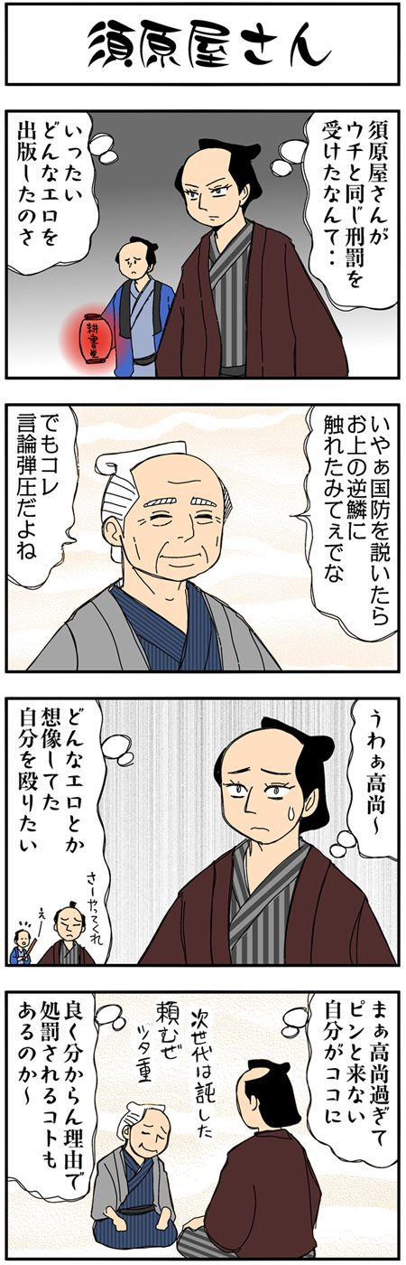 無茶な黄表紙販売で幕府に身上半減の処罰を喰らった蔦重。その次に、同じく身上半減の処罰を受けたのが須原屋市兵衛でした。