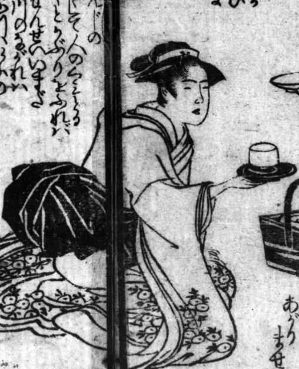 「お菊さんがお茶を運んで、蔦屋重三郎を迎えている場面」
