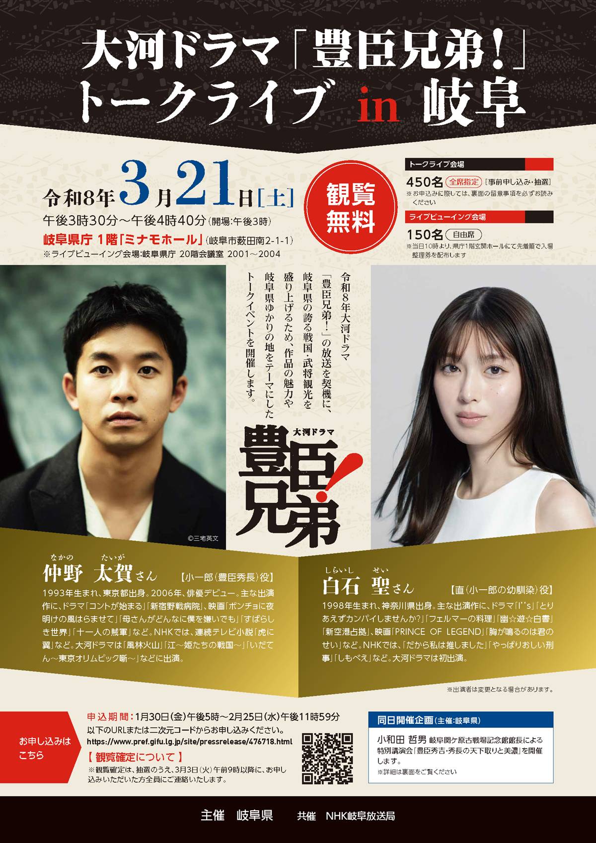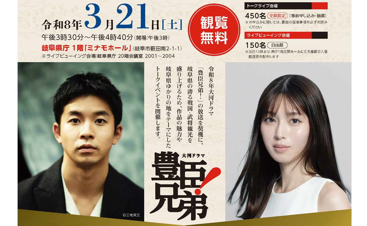ご存知、白石聖さん演じる小一郎の初恋相手ですが、その直が3月21日に岐阜県庁で開催される『豊臣兄弟トークライブ』に出演することになり、チケットの申込期限2/25が迫っています!